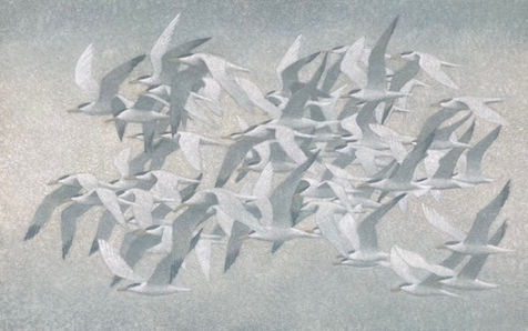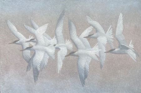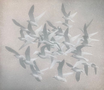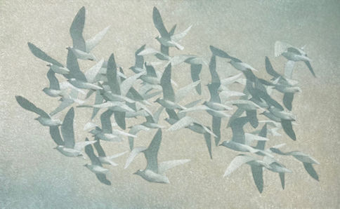 Gina Sawin’s recent work reflects her ongoing interest in depicting bird groups in a moment of flight. She is drawn to patterns of avian forms and the pictorial challenge of locating them in a real and distant sky. The limited palette and pebbly surface suggest that birds and sky are inextricable, almost dissolving into one another, while the geometry of shifting lights and darks gives a sense of movement.